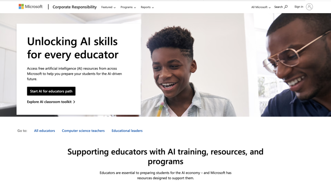 美国教师AI培训更多由企业、高校取平台配合供给图片来历于谷歌、微软官网截图